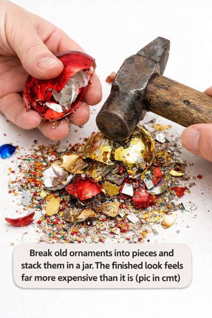 Transform your old ornaments into stunning decorative pieces with this simple DIY project. By breaking unused or outdated ornaments and stacking the pieces in a jar, you can create a chic and sophisticated vase filler that adds a touch of elegance to any room. This project is perfect for those who love to upcycle and want to give new life to old items, creating a unique piece of decor that looks far more expensive than it actually is.