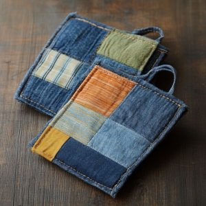 Denim pot holders are both functional and stylish. Cut two squares of denim and one of insulating material like batting. Layer the pieces with the batting in the middle, and sew around the edges. Add a loop for hanging. The thick denim provides excellent protection from heat, making these pot holders a practical kitchen accessory.