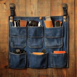 Keep your space tidy with a denim wall organizer. Cut several pockets from the jeans and sew them onto a large piece of denim or canvas. Attach loops or grommets at the top for hanging. This organizer is perfect for storing mail, tools, or craft supplies, and the pockets can be arranged in any configuration to suit your needs.