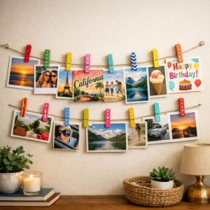 Use the clothespins to clip your photographs, postcards, or other mementos to the line. This method not only offers a charming and rustic way to display your memories but also allows for easy updating as you can swap out photos and cards whenever you wish. To add a decorative touch, consider painting the clothespins in various colors or patterns.