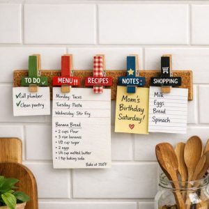 Clip your notes, grocery lists, or recipe cards into the pins for easy access and organization. This system not only helps keep your space tidy but also adds a touch of rustic charm to your decor. For a personalized touch, label or decorate each clothespin with paint or marker to categorize your notes.