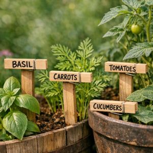 Repurpose wooden clothespins as plant markers for your garden. Simply write the name of each plant on a clothespin using a permanent marker or paint pen. Clip the labeled clothespin onto a small wooden stake or directly onto the edge of a pot.