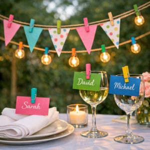 When hosting a party, wooden clothespins can be a lifesaver for creating last-minute decor and place card holders. Paint the clothespins in colors that match your party theme, and use them to clip place cards to napkins or glasses at each table setting.